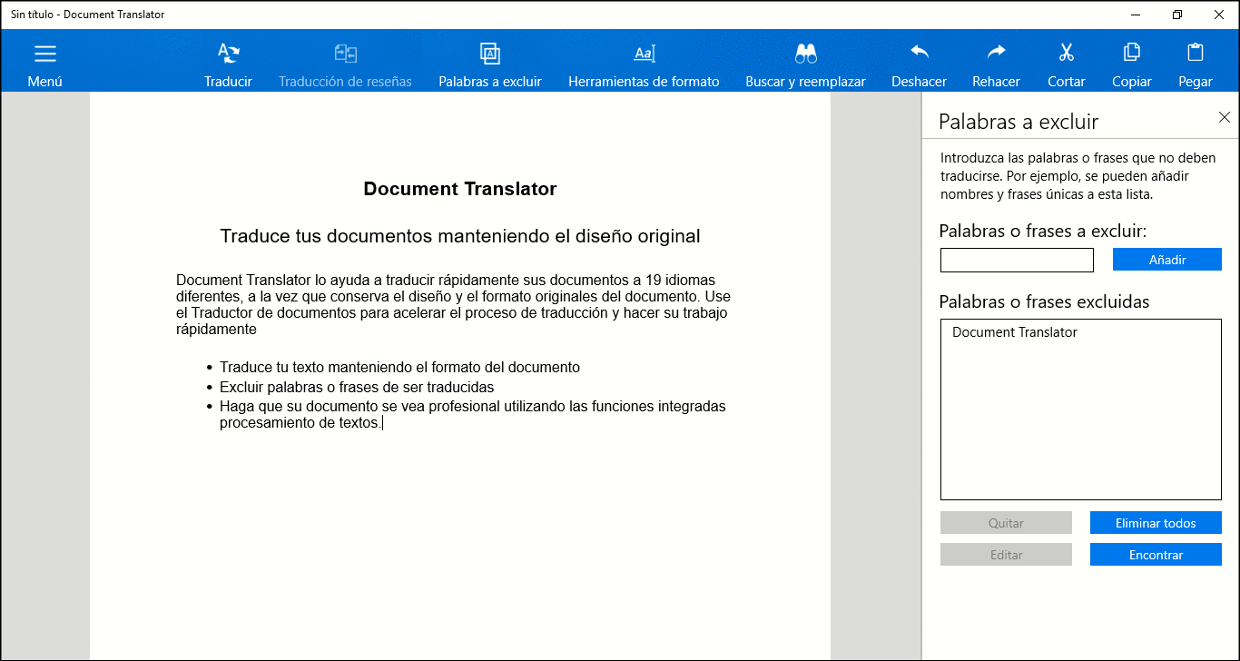 Simplemente elija un documento, seleccione el idioma y deje Document Translator Además, puede excluir varias palabras o frases de la traducción. Esta aplicación le permite evitar la traducción de ciertas palabras o frases, como nombres de lugares, productos y personas. Simplemente agregue la palabra a la lista y el Document Translator Traducir sus documentos nunca había sido tan rápido y fácil.