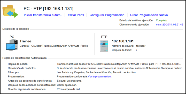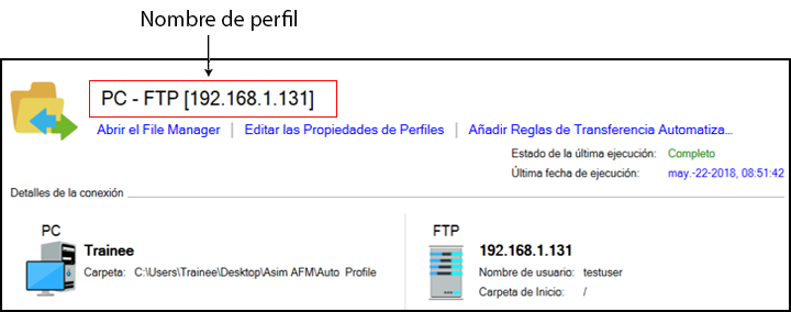 La página de información de perfil muestra la información sobre su perfil, como el tipo de transferencia, el origen, la ubicación de destino y la última fecha de conexión. Para ver las propiedades de conexión, haga clic derecho en un perfil de Panel de perfil de conexión y seleccione información del perfil.