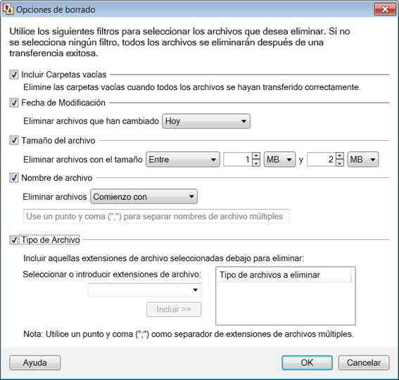 Puede optar por eliminar solo ciertos tipos de archivos. (por ejemplo, archivos .doc de Microsoft Word) o elimine todo excepto ciertos tipos de archivos (por ejemplo, puede optar por no eliminar archivos de copia de seguridad de Word [.wbk]). De forma predeterminada, todos los archivos se eliminarán luego de la transferencia automática de archivos si habilita la opción de eliminar y no configura los filtros. Con las opciones de eliminación, puede especificar archivos que no desea eliminar después de la transferencia. También puede decidir si los archivos del tamaño particular o la fecha de modificación deben eliminarse después de la transferencia o no. Además, puede usar el carácter comodín "*" para seleccionar archivos basados en patrones en sus nombres.