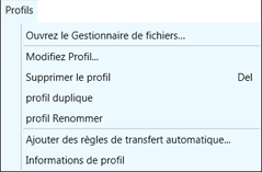 - información del perfil: Muestra la información de conexión sobre el perfil, como el tipo de transferencia, la ubicación de origen y destino, la última fecha de conexión.