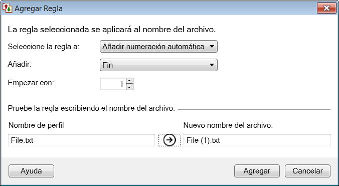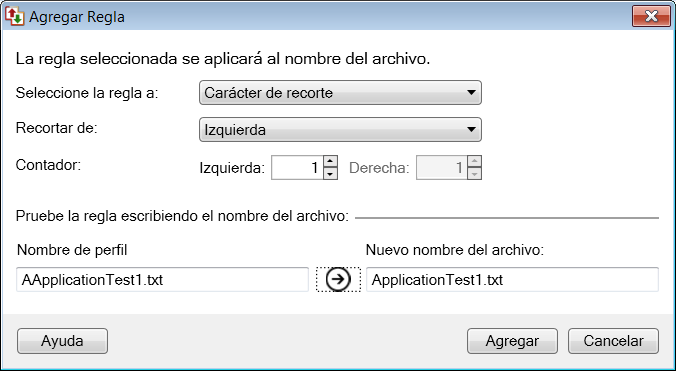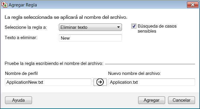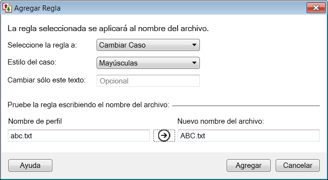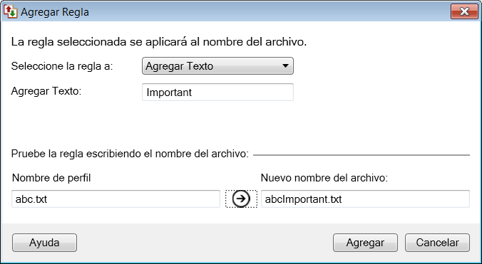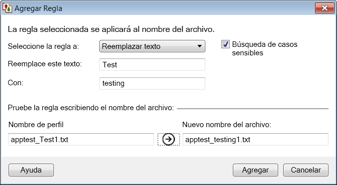 Puede probar cada regla antes de agregarla a la lista. Esto es esencial para confirmar el correcto cambio de nombre de los archivos después de la transferencia.