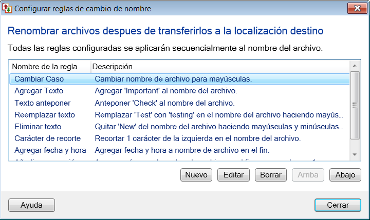 Utilice las reglas de cambio de nombre para cambiar los nombres de los archivos después de la transferencia en la ubicación de destino. Hay 8 tipos de reglas de cambio de nombre que incluyen Cambiar caso, Adjuntar texto, Anteponer texto, Reemplazar texto, Eliminar texto, Trim Character, Agregar fecha y hora y Agregar numeración automática. Las reglas seleccionadas se aplicarán en una secuencia en la que se agreguen Configurar reglas de cambio de nombre diálogo.