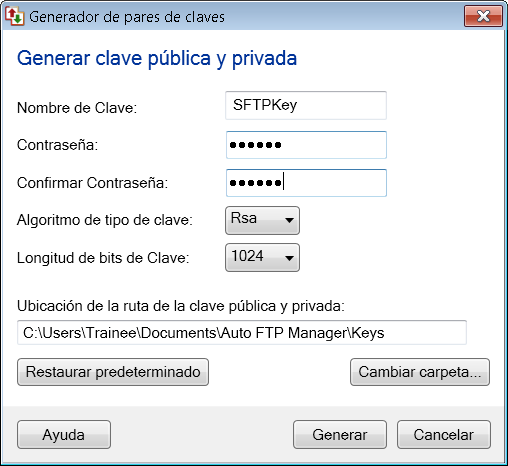En el Generador de pares de llaves diálogo, puede crear su propia clave pública y privada para conexiones SFTP.