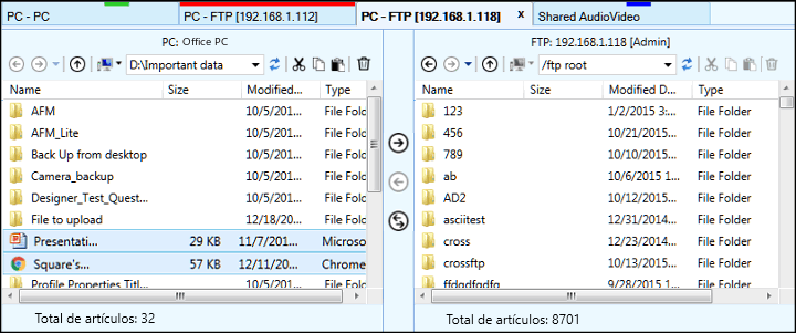 El panel de transferencia proporciona una forma simple y fácil de transferir archivos del lado izquierdo al derecho o viceversa.
