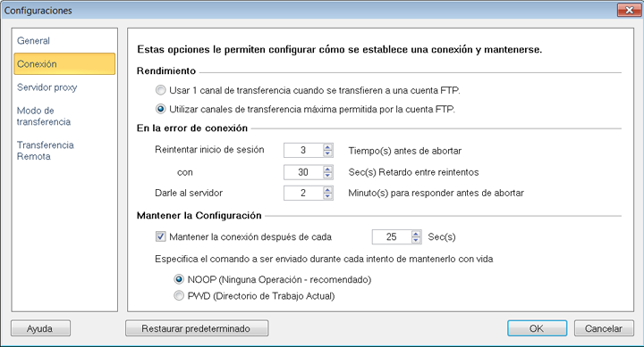 Mantener la conexión activa después de cada x seg (S) Muchos servidores FTP se desconectarán automáticamente si no se envían comandos durante demasiado tiempo. La función Keep Alive evita la desconexión al enviar comandos (que no hacen nada) regularmente. Para permitir mantener vivo, puede marcar la opción Habilitar mantener vivo. Especifique el intervalo de mantener activo con la opción Mantener intervalo activo x seg (s).