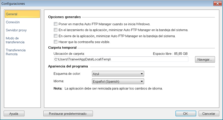Idioma: El idioma en el que se muestra la interfaz de la aplicación se puede cambiar utilizando el Idioma desplegable. Cuando se cambia el idioma, los Menús, cuadros de diálogo y títulos de ventana se mostrarán en el idioma seleccionado.