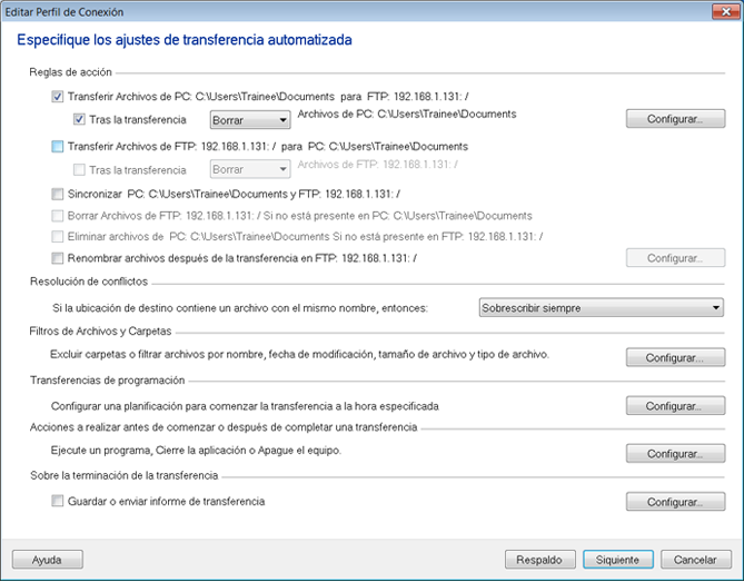 Al crear un perfil, defina todas las reglas y permita que Auto FTP Manager ejecute el perfil de acuerdo con estas reglas. En las reglas de Transferencia automatizada, puede:
