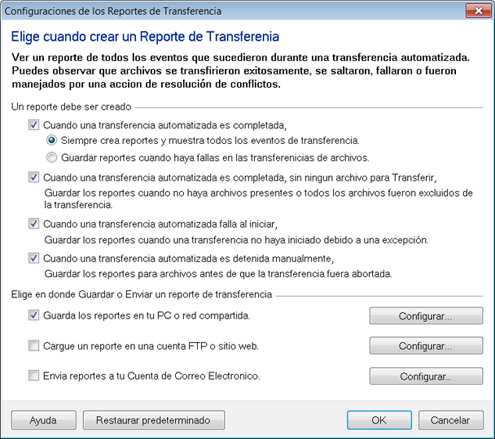 Puede optar por guardar cada informe o solo el que se creó cuando se produjo una falla en la transferencia de archivos. Guardar dirección: Decida la ubicación para guardar los informes de transferencia. Puede elegir cualquiera o todas las siguientes ubicaciones
