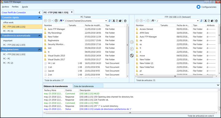 Auto FTP Manager hace que programar y automatizar tus transferencias de FTP sea sencillo. Use Auto FTP Manager para conectarse a cualquier servidor FTP y cargar y descargar archivos automáticamente. Planifica y automatiza tu flujo de trabajo. Permita que su PC mueva o sincronice archivos entre PC a servidor FTP, PC a PC, PC a dispositivo móvil Android, PC a PC remota y servidor FTP a servidor FTP automáticamente de acuerdo con un cronograma.