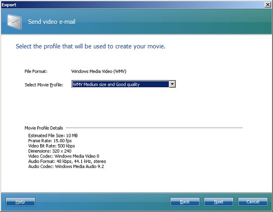 Para enviar la película como vídeo por correo electrónico, seleccione Enviar vídeo por correo electrónico la hora de exportar. Auto Movie Creator Envía el vídeo como un archivo adjunto. Correo electrónico de vídeo siempre se crea como Windows Media Video (WMV), que es altamente compatible y produce un pequeño archivo adecuado para enviar por correo electrónico.