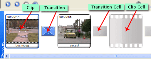 El guión gráfico es el área donde crear y editar su proyecto. Parece una tira de película. Cada escena de la película final se muestra como un clip. Entre el clip células (en el que se pueden colocar los clips/aún imágenes) son las células de transición, donde se pueden agregar transiciones. Utilizar el guión gráfico para ver la secuencia de los clips en el proyecto y reorganizarlos. Puede ver los distintos elementos de su proyecto en breve.