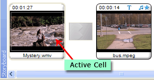 Cada vez que pulse el botón derecho sobre un efecto y seleccione 'Agregar a guión gráfico' archivo de música, título o crédito o transición, se añade a un clip en la celda seleccionada (una pulsar y que tiene un borde oscuro alrededor) o la celda activa, el uno que trabajó por última vez en. La celda activa tiene una línea de puntos alrededor de ella (véase la figura 1).