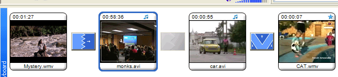 Un clip puede arrastrar y colocar para cualquier celda hacia la izquierda en el guión gráfico; incluso el uno anterior a ésta. Cuando se coloca el nuevo clip, el clip existente se desplaza a la siguiente celda en el guión gráfico. Consulte la figura 2 y figura 3 y tratar de entender cómo funcionan arrastrando y soltando. El clip de 'monks.avi' en la figura 2 se cayó de su posición a la segunda celda que contiene el clip de 'car.avi'. Como puede ver en la figura 3, el clip 'car.avi' (y el clip después) se ha desplazado a la celda siguiente a su derecha y clip de 'monks.avi' ha ocupado su posición en la segunda celda.