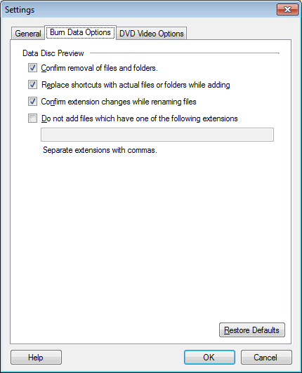 Hay algunos ajustes que se tienen que ajustarse al añadir archivos para crear un disco. Clic Herramientas >> Configuración >> Opciones de grabación de datos para habilitar las características siguientes: