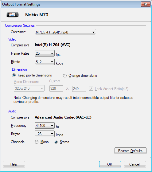 Sus archivos multimedia se convierten al formato MPEG-4. los Intel (R) H.264 (AVC) El compresor toma menos espacio que otros compresores para la misma calidad. La velocidad de fotogramas se ajusta a 25 Fps Y la velocidad de bits es 512 Kbps. Puede elegir conservar o cambiar las dimensiones del vídeo.