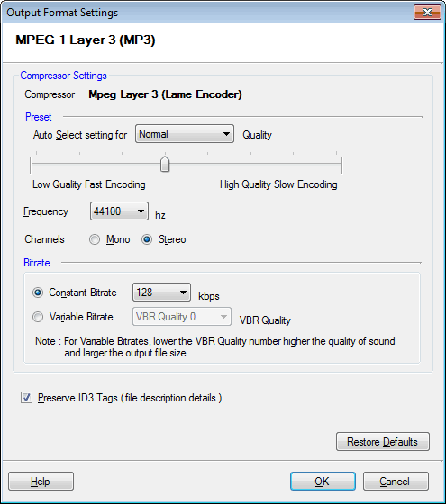 Algunos presets MP3 incorporados están diseñados para proporcionar el mejor equilibrio posible de calidad y tamaño de archivo. Ellos han sido afinados usando rigurosas pruebas de audición. Estos ajustes preestablecidos son altamente recomendables sobre cualquier conjunto personalizado de parámetros. El ajuste predeterminado es el Normal programar. Para usar un Preset, selecciónelo Ajustes de selección automática para O arrastre el control deslizante. Una codificación de mayor calidad lleva más tiempo que una calidad inferior.