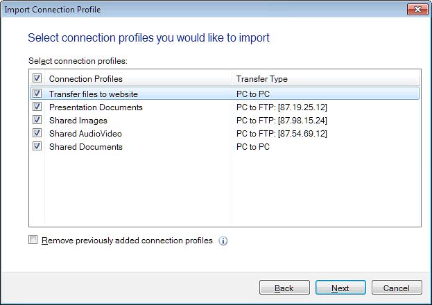 Por defecto, todos los perfiles de conexión están marcados. Puede elegir los perfiles que desea excluir al deseleccionarlos. Para agregar los perfiles de conexión listados en el archivo de copia de seguridad y mantener todos los existentes, desmarque Eliminar los perfiles de conexión previamente agregados.