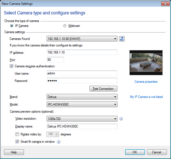 . Si tiene éxito, la transmisión de video de la cámara aparecerá en la ventana de vista previa.