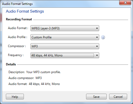 El formato MP3 hace que las grabaciones de su pantalla se reproduzcan en su PC o cualquier reproductor portátil. Hacer clic Herramientas >> Grabadora de audio >> Seleccionar configuraciones de formato de audio >> MPEG Layer-3 (MP3) >> Personalizar.