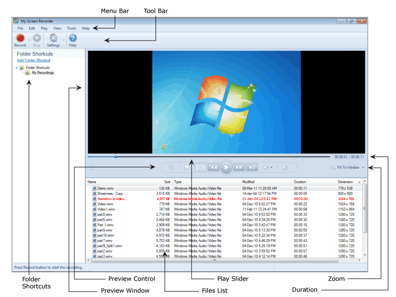 - Las grabaciones de pantalla se guardan como archivos WMV o AVI y se muestran en Lista de archivos.