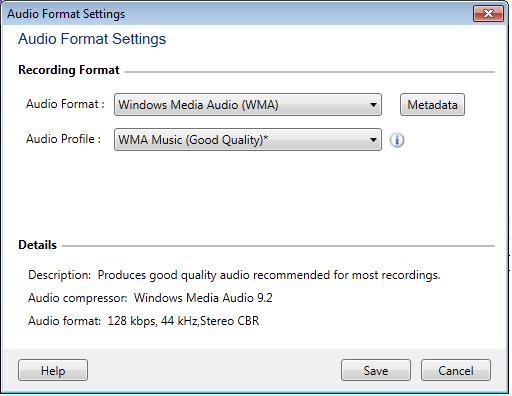 Seleccione un Perfil de audio. En general, los ajustes de menor calidad son suficientes para la grabación de solo voz, mientras que los perfiles de mayor calidad se deben usar si se está grabando música.Puede crear su propio perfil de audio seleccionando Perfil personalizado opción de la lista desplegable. Formatos de archivo personalizados están disponibles para WMA y MP3 grabación.