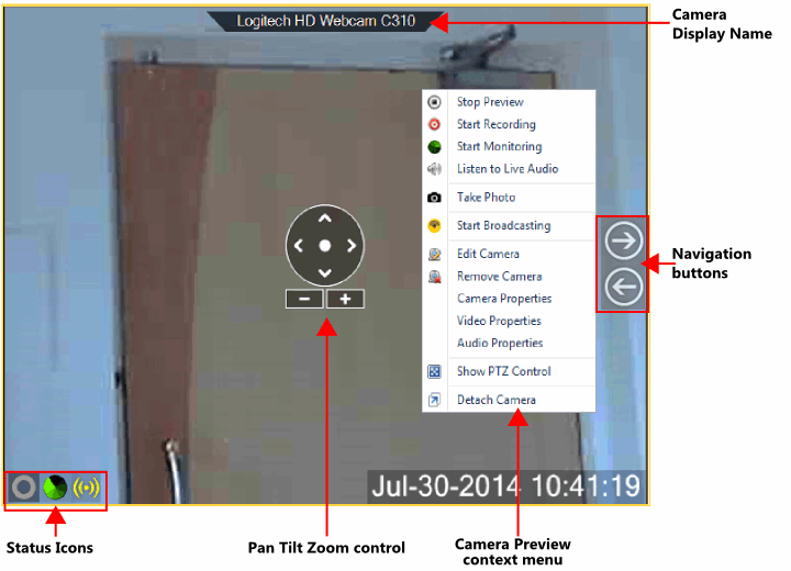 Security Monitor Pro le permite controlar la configuración de su cámara usando el menú contextual de Vista previa de la cámara. La ventana de vista previa también le permitirá controlar las cámaras que admiten Pan / Tilt / Zoom.