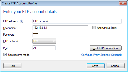 Puerto: El puerto del servidor es el puerto en el que Security Monitor Pro intentará conectarse al servidor FTP. Esto es normalmente 21; sin embargo, puede ser diferente si está pasando por un firewall o si el administrador del Servidor FTP ha asignado el protocolo FTP a otro puerto.