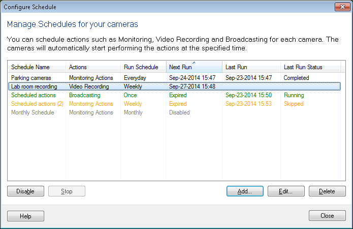Con la ayuda de Security Monitor Pro, puede establecer horarios individuales para cada cámara. Puede programar cada cámara de forma independiente para realizar diversas acciones, como monitorear con alertas o grabar videos, capturar fotos y transmitir. Usted puede Añadir, Editar Un horario acorde a su necesidad. Si no desea que una programación se ejecute a una hora específica, tampoco Inhabilitar (cuando el horario no se está ejecutando) o Detener it (cuando el calendario se está ejecutando). Cuando no desee ejecutar un programa en una cámara, seleccione Borrar.