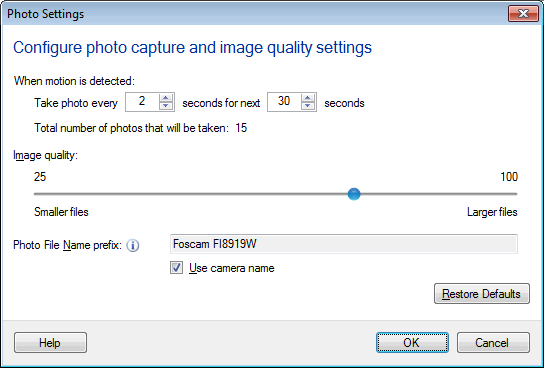 Security Monitor Pro creará un archivo JPEG, con el nombre proporcionado en el campo Prefijo. Debería elegir un prefijo significativo que le ayude a identificar los archivos, como "MainHall" o "DisplayCase". Por defecto, el Usar el nombre de la camara La opción está marcada. La fecha y la hora se agregarán al nombre del archivo automáticamente. Esto puede hacer que las fotos sean más útiles como evidencia.
