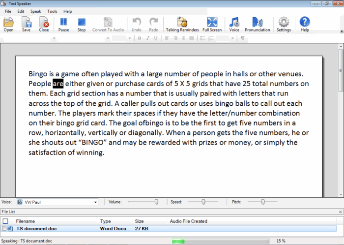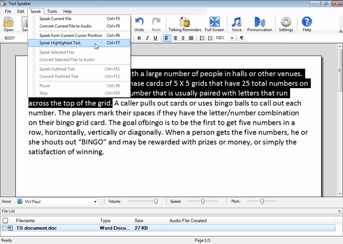 Hacer clic Habla >> Habla el archivo actual para que el documento sea leído desde el principio. A medida que se pronuncia cada palabra, se resalta para que pueda seguir junto con el texto mientras escucha.