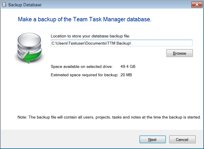 Nota: Con fines simplicidad, Team Task Manager es compatible con una copia de seguridad de base de datos completa. Otros tipos de copia de seguridad como diferencial, archivo / grupo de archivos, diferencial de archivos no son compatibles.