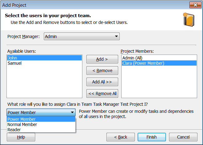 - Miembros del Proyecto: Esta lista muestra los usuarios asignados al proyecto. El Administración y Administrador Secundario se consideran una parte de cada proyecto. Usted puede añadir más miembros del equipo en un proyecto seleccionándolos de la lista de Usuarios disponibles que aparece en el lado izquierdo de la pantalla. El usuario seleccionado se incluye en la Miembros del Proyecto Lista. Puede asignarles los roles de la ¿Qué papel le gustaría asignar ...? en el menú desplegable. Por defecto, el usuario puede asignar el papel de un Potencia miembros en el proyecto. Sin embargo, puede cambiar la función del usuario a Normal miembros o Reader.