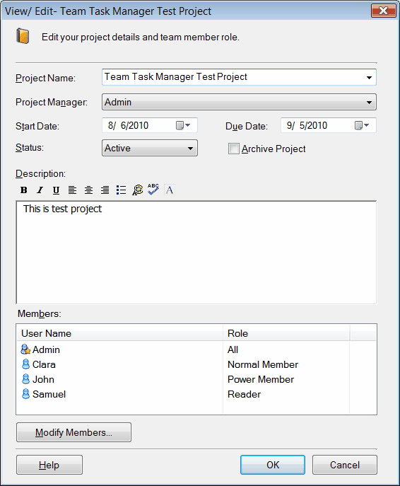 - Modificar Miembros: Puede seleccionar un miembro del equipo diferente como gerente de proyectos de la Modificar Miembros del equipo diálogo. También puede optar por el miembro del equipo que desea incluir o excluir de su equipo de proyecto. El papel del miembro se puede cambiar a un Potencia miembros, Normal miembros o Reader.