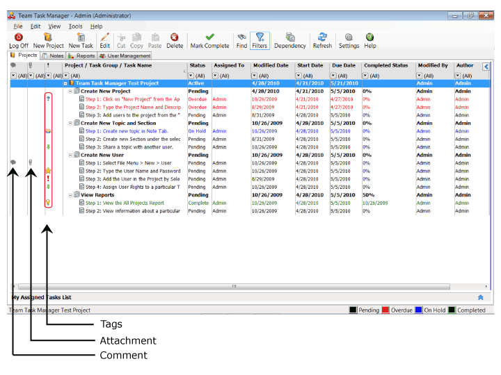 Las dos primeras columnas de la lista de tareas espectáculo comentarios y archivos adjuntos. Puede abrir el comentario y el apego haciendo doble clic sobre el icono.