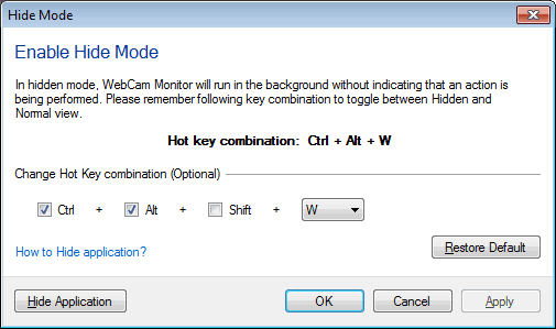 Para ocultar o mostrar la aplicación, debe establecer y recordar la combinación de teclas de acceso rápido. De forma predeterminada, Ctrl + Alt + W se establece como tecla de acceso rápido. Si cambia el valor predeterminado, seleccione una combinación de teclas de acceso rápido que pueda recordar fácilmente. Seleccione una combinación de teclas y haga clic en Aplicar botón.