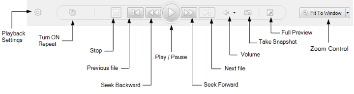 Ventana de previsualización: La ventana de vista previa le permite reproducir su grabación de vídeo, así como ver las fotos capturadas que están presentes en la lista de archivos. Los Controles de vista previa le permiten administrar la reproducción de sus grabaciones de vídeo. Puede reproducir / pausar, detener, rebobinar o reenviar las grabaciones.