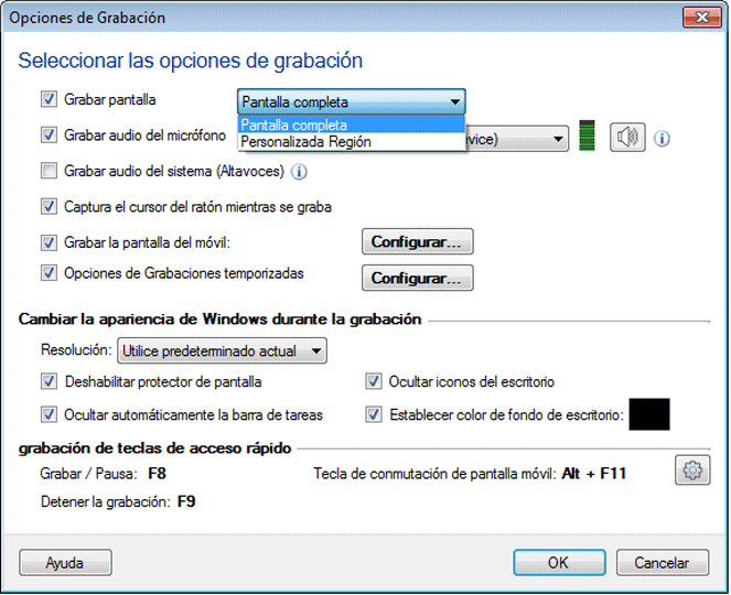 - Elija grabar en pantalla completa, región personalizada o una ventana de aplicación