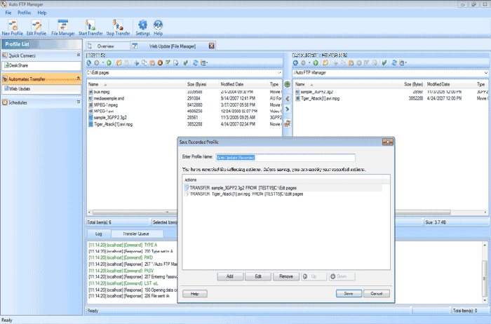 starts, you can perform numerous actions like transferring files between PC and the server, Delete, rename, move files etc. Stop the recording by clicking the same button and save the profile.