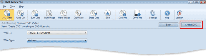On the next screen, choose the drive of your data disc from the Write To dropdown and click Create DVD. Watch the new disc created on any DVD player.