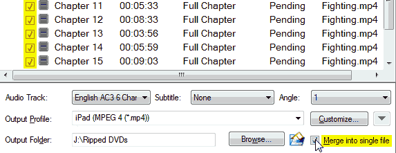 You can merge multiple titles or chapters into a single file. This can be done by selecting the desired titles or chapters and then checking the Merge To Single File option given in Edit menu or by checking Merge into single file option as shown in the below image.