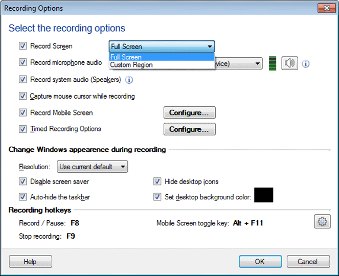 - Choose to record the full screen, custom region, or an application window